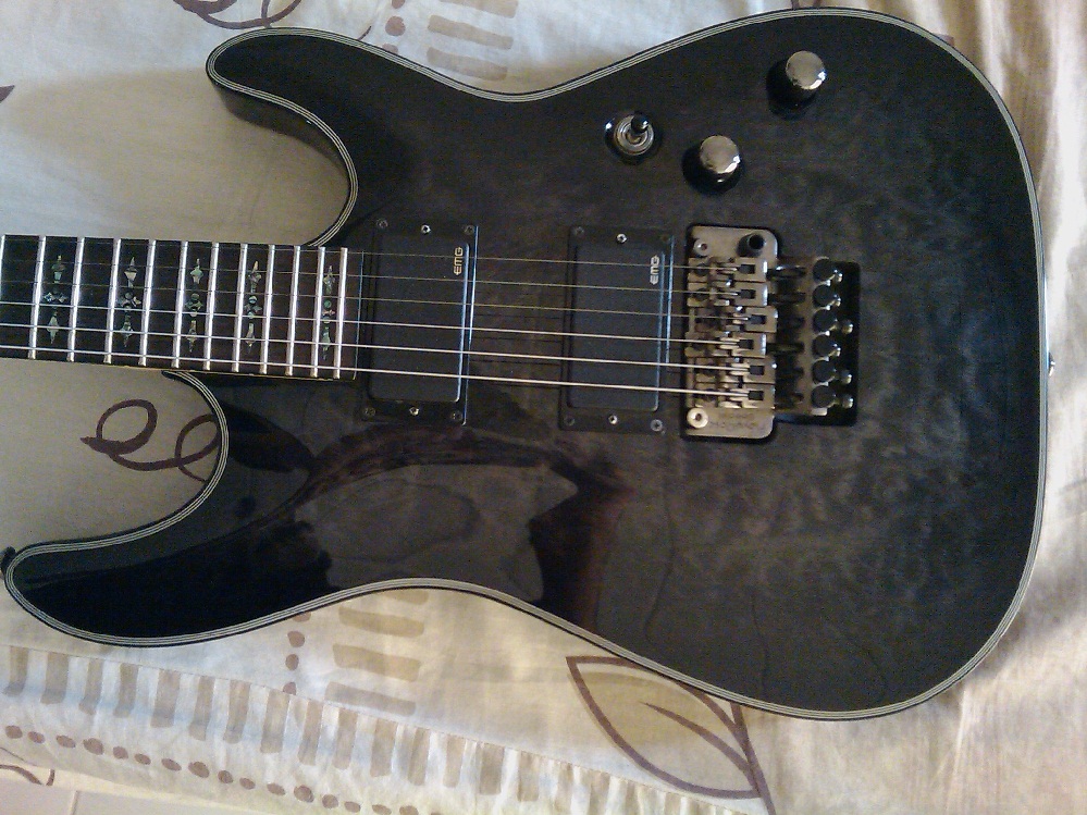 Schecter Damien Elite FR Electric Guitar Features: Construction: Double-cutaway Back: Mahogany Top: Quilted maple Neck: Bolt-on maple neck Scale: 25-1/2" Fingerboard: Rosewood Frets: 24 extra-jumbo Nut: GraphTech Tusq Inlays: Stained cross Bridge pickup: Active EMG-81 humbucker Neck Pickup: Active EMG-85 humbucker Electronics: Vol /Tone/3-way switch Bridge: Floyd Rose special tremolo Tuners: Grover Hardware: Black chrome Case: Sold separately ซื้อมาได้ประมาณ 7 เดือนแล้วครับ ไม่ค่อยมีเวลาเล่นจะเอาเงินไปซื้อโทรซับ