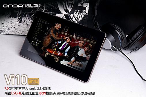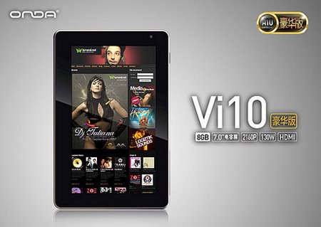Onda รุ่น Vi10 Deluxe Edition หน้าจอขนาด 7.0 นิ้ว ความละเอียด 800?480 พิกเซล จอ Multi Touch ใช้ขุมพลัง 1.5GHz ARM Cortex-A10 ,Mali-400GPU, หน่วยความจำ DDR3 512 MB ขนาดความจุในตัวเครื่อง 8GB พร้อมเพิ่มความจุได้ด้วย microSD กล้องดิจิตอลด้านหน้าความละเอียด 1.3 ล้านพิกเซล รองรับ WiFi, HDMI Port รันบนระบบปฏิบัติการ Android 2.3