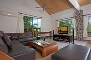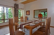 ผ่านบันไดหินอ่อนสู่ชั้นบนคุณจะพบกับห้องนั่งเล่น กรอบหน้าต่างไม้สูงรอบห้อง เปิดรับลมทะเลตลอดวัน พร้อมโต๊ะกลางไม้และกระจกรูปทรงแข็งแรง และโซฟาหนังสีเทา เข้ากับเสาอิฐ จากมุมนี้คุณจะได้ซึมซับวิวอันสวยงามที่สุดของสวน และที่ขาดไม่ได้สำหรับความบันเทิง ก็คือทีวีจอแบน เคเบิลทีวี เครื่องเล่นดีวีดี และระบบเสียงระบบเซอร์ราวด์ ห้องรับประทานอาหาร