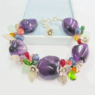 สร้อย ข้อมือสุดเก๋ที่ประดับประดาไปด้วยพลอยอ เมทิสต์เม็ดใหญ่ถึง 5 เม็ดด้วยกัน แต่งเติมด้วยการนำหินสีหลากสีสันร้อยเรียงอยู่เป็นตัวคั่นอย่างน่ารักสดใส เสริมด้วยดอกไม้และใบไม้เงิน สวยงามมากเลยทีเดียว **เงินแท้ 92.5% พลอยแท้ สินค้ามือหนึ่ง ราคาส่งขายโดยผู้ผลิต**