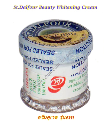 ST. DALFOUR ครีมคูเวต ( รุ่น em ) เหมาะสำหรับผู้มีปัญหาสิว ฝ้า กระ มากเป็นพิเศษ ลักษณะเป็นครีมเนื้อเนียนสีเบสและมีน้ำมันซีรัมมาก ซึ่งช่วยทำให้แก้ปัญหาฝ้า กระ และสิวอักเสบต่างๆ ได้ดี ด้วยสารสกัดจากสมุนไพรหลายชนิดจากตะวันออกกลาง และน้ำนมบริสุทธ์ ที่ช่วยทำให้หน้าขาวใส ราคา 600.00 บาท