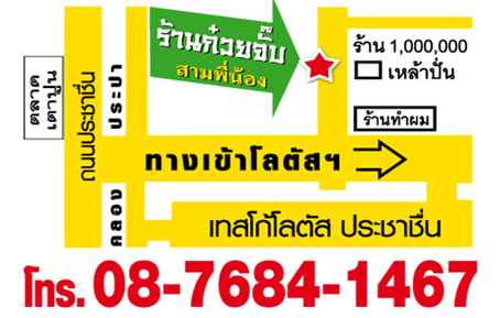 ทางเข้าร้านอยู่ตรงข้ามกับตลาดเตาปูน ริมคลองประปา เขตบางซื่อ เลี้ยวเข้าไปทางเข้าเทสโก้โลตัส สาขาประชาชื่น แต่เลี้ยวซ้ายซอยแรก ตรงข้ามกับร้าน 1,000,000 เหล้าปั่น หน้าร้านมีรูปอาหารติดอยู่ครับ