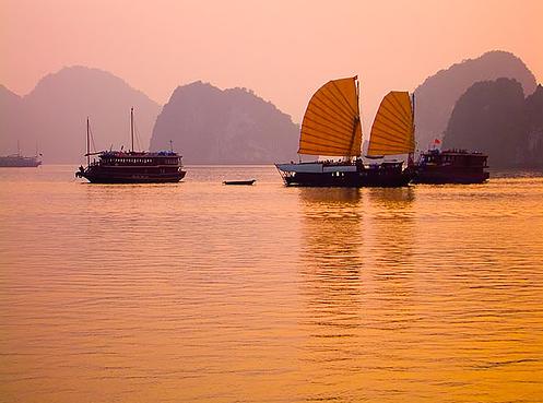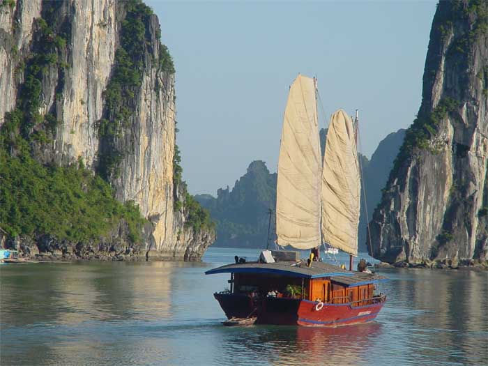 นำท่านออกเดินทางสู่ท่าเรือ เพื่อล่องเรือชมความงามตามธรรมชาติ ที่สรรค์ สร้างด้วยความงดงามดังภาพวาดโดยจิตกรเอก อ่าวฮาลองประกอบด้วยหมู่เกาะน้อยใหญ่กว่า 1,900 เกาะ และได้รับการประกาศเป็น “มรดกโลก”โดยองค์การยูเนสโก อ่าวแห่งนี้เต็มไปด้วยภูเขาหินปูนมากมาย ระหว่างการล่องเรือท่านจะได้ชมความงามของเกาะแก่งต่าง ๆ ทั้งเกาะหมา เกาะแมว เกาะไก่ชน ฯลฯ นำท่านชมถ้ำสวรรค์ ชมหินงอกหินย้อยมากมาย ล้วนแต่สวยงามและน่าประทับใจยิ่งนัก ถ้ำแห่งนี้เพิ่งถูกค้นพบเมื่อไม่นานมานี้ ได้มีการประดับแสงสีตามผนังและมุมต่าง ๆ ในถ้ำ ซึ่งบรรยากาศภายในถ้ำท่านจะชมความสวยงามตามธรรมชาติที่เสริมเติมแต่งโดยมนุษย์ แสงสีที่ลงตัวทำให้เกิดจินตนาการรูปร่างต่าง ๆ มากมาย ทั้ง รูปมังกร เสาค้ำฟ้าทั้ง 4 เสา รูปปีกอินทรี รูปนางฟ้า รูปคู่รักหนุ่มสาว พระพุทธรูป ฯลฯ ตลอดจนเลือกซื้อสิ้นค้าที่ระสึกต่างๆ ตามอัธยาศัยได้เวลาอันสมควรนำท่านกลับสู่เรือเพื่อเดินทางกลับสู่ท่าเรือฮาลอง