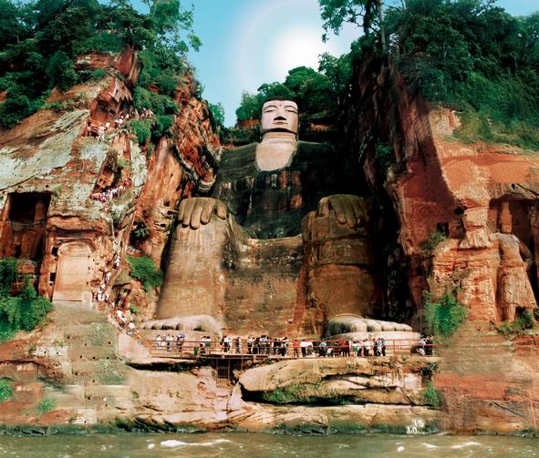 จากนั้น เดินทางถึงเมือง เมืองเล่อซาน เมืองนี้มีอายุกว่า1,300 ปี ตั้งอยู่ที่ริมแม่น้ำซึ่งเป็นที่รวมของแม่น้ำ 3 สาย คือ แม่น้ำซิงหยี แม่น้ำหมินแม่น้ำต้าตู้ มาบรรจบกัน ทำให้เกิดอุทกภัยทุกปีที่เมืองนี้ แต่หลังจากสร้างองค์ หลวงพ่อโตเสร็จเรียบร้อยแล้ว ก็ไม่เกิดอุทกภัยอีกเลย นำท่านลงเรือเพื่อล่องเรือ ชมหลวงพ่อโตเล่อซาน ท่านจะเห็นหลวงพ่อโตเล่อซาน ซึ่งเป็นพระแกะสลักภูผาที่ใหญ่ แกะสกัดเข้าไปในหน้าผาหิน สูง 71 เมตร เฉพาะพระเศียรสูง 14.7 เมตร กว้าง 10 เมตร พระกรรณยาว 7 เมตร พระเนตรยาว 3.3 เมตร หลังพระบาทกว้าง 8.5 เมตร นิ้วพระบาทแต่ละนิ้วสูงท่วมหัวคน (ซานซื่อยีจุนโฝ โฝซื่อยีจั้วซาน -ภูเป็นพระรูปหนึ่ง พระคือภูลูกหนึ่ง) ใช้เวลาก่อสร้างนานถึง 90 ปี พระพักตร์จะหัน ออกมาทางแม่น้ำหมิงเจียง (สร้างในปี ค.ศ. 713-803) โดยการนำของหลวงพ่อ ไห่ทงโดยใช้เงินบริจาคของชาวบ้าน จุดประสงค์เพื่อเป็นสิริมงคลปกป้องภัยน้ำท่วม จากการเอ่อล้นของแม่น้ำ 3 สาย (หมิงเจียง ซิงอีเจียง ตู้เจียง) ที่มาบรรจบพอดีที่เมืองเล่อซาน