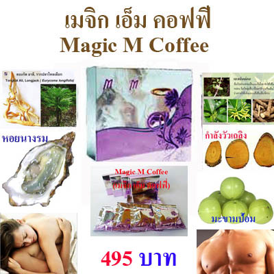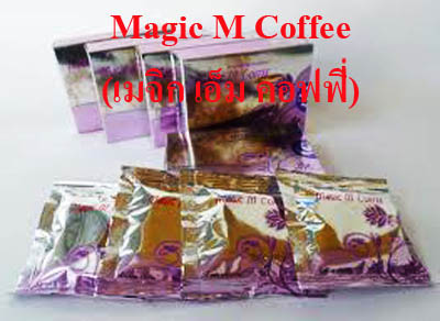 Magic M Coffee(เมจิก เอ็ม คอฟฟี่) กาแฟที่จะทำให้คุณคึกคัก เพิ่มพละกำลัง เหมือนตอนหนุ่ม ๆ มั่นใจได้เต็มที่ทุกสนามรัก เพียงแค่ชงดื่ม 15-30 นาที ก่อนมีกิจกรรม ด้วยส่วนผสมสมุนไพรชั้นยอด คือ เถาว์เอ็นอ่อน กำลังวัวเถลิง ตองกัสอาลี สารสกัดจากหอยนางรม มะขามป้อม