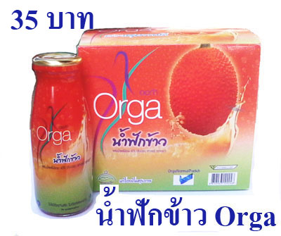 น้ำฟักข้าว Orga ผลิตจาก ลูกฟักข้าวคุณภาพดี ที่มีสารเบตาแคโรทีนและสารไลโคพีนในปริมาณสูงมาก บรรจุด้วยระบบพาสเจอร์ไรส์ เป็นผลิตภัณฑ์เครื่องดื่มผลไม้เพื่อสุขภาพ(พร้อมดื่ม)ที่กำลังได้รับความนิยมสูงสุดในขณะนี้