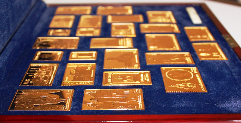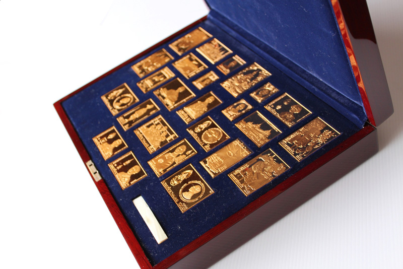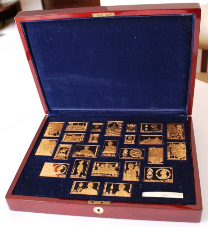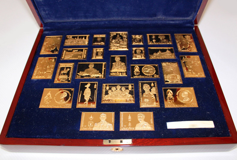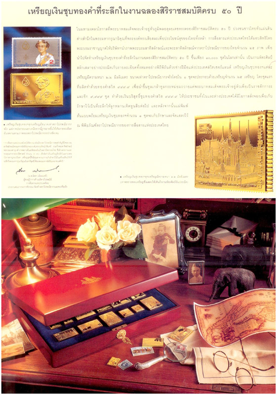 ในมหามงคลวโรกาสที่พระบาทสมเด็จพระเจ้าอยู่หัวภูมิพลอดุลยเดชทรงครองราชสิริราชสมบัติครบ 50 ปี ปวงชนชาวไทยทั่วแผ่นดินต่างสำนึกในพระมหากรุณาธิคุณที่พระองค์ทรงเสียสละเพื่อประโยชน์สุขของไทยทั้งหล้า การสื่อสารแห่งประเทศไทยได้มอบสิทธโดยพระบรมราชานุญาตให้บริษัทฯนำภาพพระบรมสาทิสลักษณ์และพระสาทิสลักษณ์จากตราไปรษณียากรของไทยจำนวน 25 ภาพ เพื่อนำไปจัดทำเหรียญเงินชุบทองคำที่ระลึกในงานฉลองสิริราชสมบัติครบ 50 ปี ขึ้นเพียง 10,000 ชุดในโลกเท่านั้น เป็นงานหัตถศิลป์สลักเสลาอย่างประณีตเก็บรายละเอียดทั้งหมดอย่างพิถีพิภันด้วยช่างฝีมือแห่งประเทศสวิตเซอร์แลนด์ เหรียญเงินชุบทองฯแต่ละเหรียญมีความหนา 2.2 มิลลิเมตร ขนาดเท่าตราไปรษณียากรจริงโดยใน 1 ชุดจะประกอบด้วยเหรียญจำนวน 25 เหรียญ โดยชุดแรกที่ผลิตทำด้วยทองคำสวิส 999.9 เพื่อนำขึ้นทูลเกล้าทูลกระหม่อมถวายแด่พระบาทสมเด็จพระเจ้าอยู่หัวเพื่อเป็นราชสักการะ และอีก 9,999 ชุด ทำด้วยเงินบริสุทธิ์ชุบทองคำสวิส 999.9 ให้ประชาชนทั้งในและต่างประเทศได้มีโอกาสสั่งจองเพื่อเก็บรักษาไว้เป็นที่ระลึกให้ลูกหลานเทิดทูนสืบต่อไป และหลังจากนั้นแม่พิมพ์ต้นแบบพร้อมเหรียญเงินชุบทองฯจำนวน 1 ชุดจะเก็บรักษาและจัดแสดงไว้ ณ พิพิธภัฯฑ์ตราไปรษณียากรของการสื่อสารแห่งประเทศไทย
