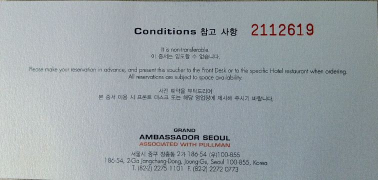 ขาย Voucher ห้องพัก The Grand Ambassador Seoul (Superior room) 2 คืนพร้อม อาหารเช้า ใช้ได้จริงครับ ได้จากการจับฉลากในงาน "World of Accor"ครับ. ราคาใน Agoda วันนี้อยู่ที่ประมาณ USD 188++ room only ไม่น่าจะมี อาหารเช้า ผมขายในราคา แค่ 6,000 บาทสำหรับ 2 คืนครับ ผมแนบรูปมาให้ดูนะครับ สนใจติดต่อ