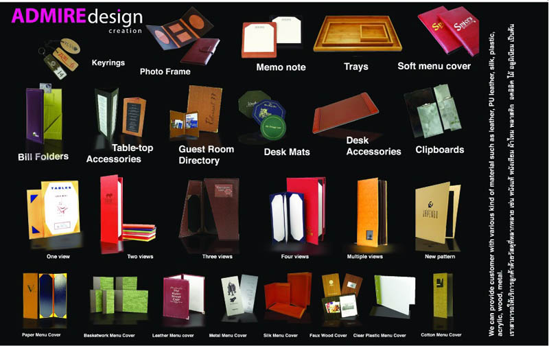 หากคุณกำลังมองหาว่ารูปแบบของปกเมนู ปกเมนูร้านอาหาร เมนูไวน์ ปกใบประกาศนีย์บัตร โฟลเดอร์ใส่เอกสาร จะออกมาในรูปแบบใด คุณกำลังมองหามาถูกที่แล้ว Admire Design เราให้คุณมากกว่าคำว่า ปกเมนู เรายังให้ไอเดียเก๋ๆในการออกแบบวัสดุสามารถเลือกใช้ได้หลากหลายอาทิเช่น หนังแท้ หนังเทียม ผ้าชนิดต่างๆรูปแบบและขนาดของปก สามารถกำหนดได้เลือกสกรีนโลโก้ ปั๊มจม ปั๊มนูน ปัก ได้ตามต้องการรวมทั้งให้คำปรึกษาในการออกแบบจากผู้เชี่ยวชาญได้อย่างดีเยี่ยม เราสามารถทำให้ปกแฟ้มธรรมดา กลายเป็นของที่ช่วยให้ภาพลักษณ์ในการขายสินค้าดีขึ้น เป็นการออกแบบเฉพาะเพื่อคุณและไม่เหมือนใคร โดยไม่คิดค่าออกแบบ รับผลิต และ รูปแบบและขนาดของปก สามารถกำหนดได้เลือกสกรีนโลโก้ ปั๊มจม ปั๊มนูน ปัก ได้ตามต้องการ