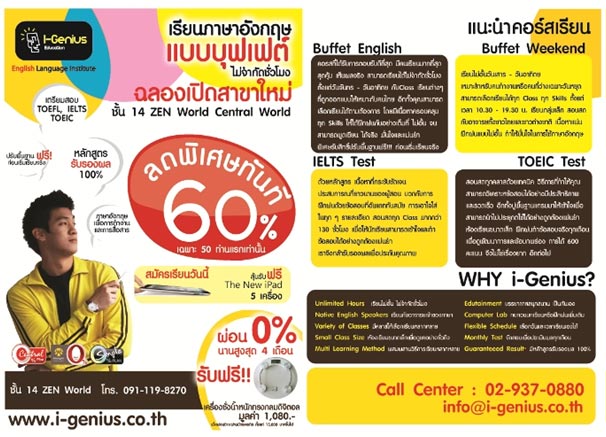 Facebook: http://www.facebook.com/IGeniusZenWorldI-Genius Education @ZEN (Central World) สถาบันสอนภาษาอังกฤษแนวใหม่ ลดราคา 60%ฉลองเปิดสาขาเฉพาะ 50 คนแรกเท่านั้น !!!