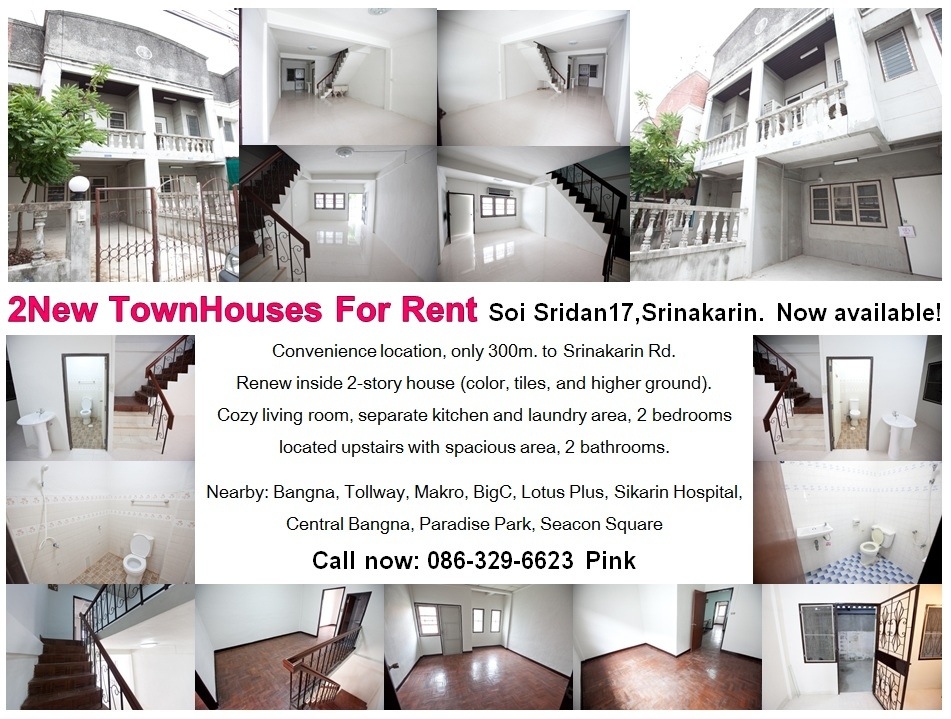 ให้เช่า ทาวน์เฮาส์ ศรีนครินทร์ ซอยศรีด่าน17 สะดวกปลอดภัย ภายในปรับพื้นสูง ทาสีใหม่ กระเบื้อง/สุขภัณฑ์ใหม่ ...เข้าอยู่ได้ทันที 2ห้องนอน 2ห้องน้ำ 1ห้องนั่งเล่น 1ห้องโถง 1ห้องครัว จอดรถในรั้ว 1คัน มี2ชั้น มีแอร์บนล่าง 300ม.จากปากซอย ใกล้: บางนา ทางด่วน แม๊คโคร บิ๊กซี ศรีนครินทร์ โลตัสพลัส รพ.ศิครินทร์ เซ็นทรัลบางนา พาราไดซ์พาร์ค ซีคอนสแควร์ สนใจติดต่อ: 086-329-6623 คุณพิ้งค์