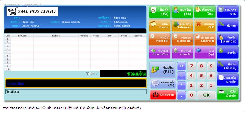 SML POS สามารถออกแบบหน้าจอขายได้เอง เพื่อความเหมาะสมกับวิธีขายสินค้า และอุปกรณ์ เช่น ถ้าใช้จอ Touch Screen ก็สามารถกำหนดปุ่มต่างๆได้เอง กำหนดขนาดของปุ่มได้เอง พร้อม Function ที่เหมาะสมสำหรับกิจการ