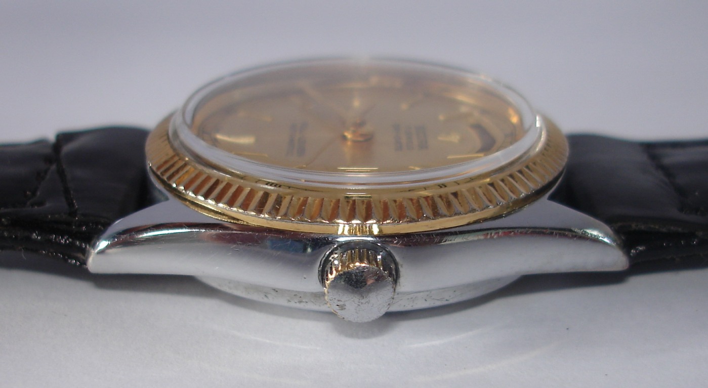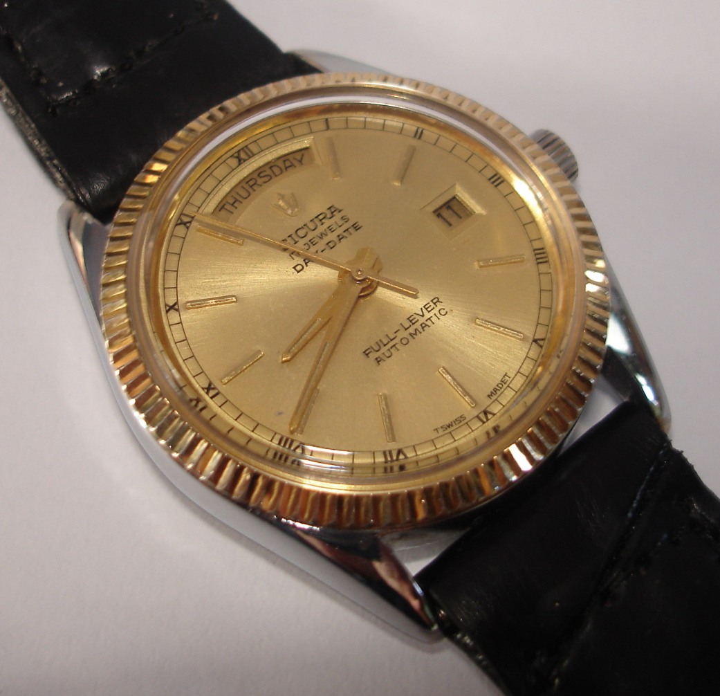 นาฬิกา SICURA Day-Date FULL-LEVEL ระบบ Automatic มีวันและวันที่ หน้าปัดสีทองเดิมๆ ขอบสีทองเงางาม ตัวเรือนสแตนเลส ขนาด 35 ม.ม. พร้อมสายหนังจรเข้สีดำแท้หัวสายสีทองไม่เดิม เครื่องสีทองสวยสะอาดตาบอกถึงการเก็บรักษาดี เป็นนาฬิกา Swiss แท้ถึงชื่อเสียงจะไม่ดังแต่รูปทรงสามารถเพิ่มบุคลิกให้กับผู้ใส่ได้เป็นอย่างดีในราคาไม่แพงครับ