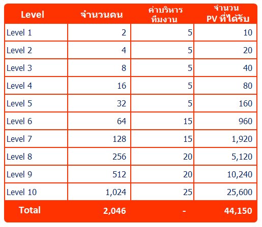 6.แนะนำได้มากกว่า 2คน แล้วล้นไปหาสมาชิกคนไหน รับรายได้ ตามลำดับชั้น เริ่มต้นที่ 10 บาท และชั้นสุดท้าย สูงสุดที่ 30บาท รับยกทั้งสาย แผนรายได้แบบทวีคูณ