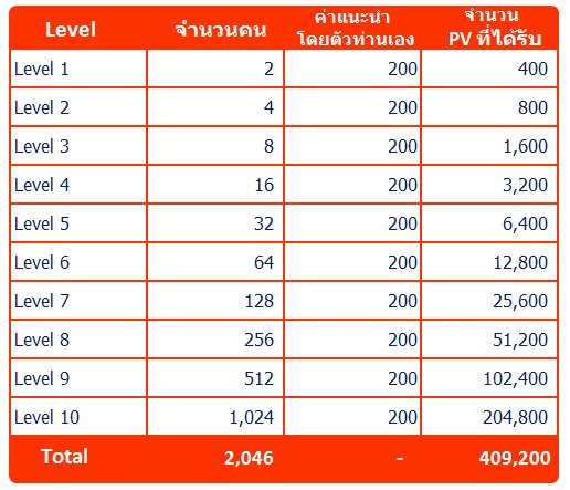 4.สายงานธุรกิจเป็นแบบเมตทริก 2x10 (ติดตัว2คน และลึกสุด10ชั้น)