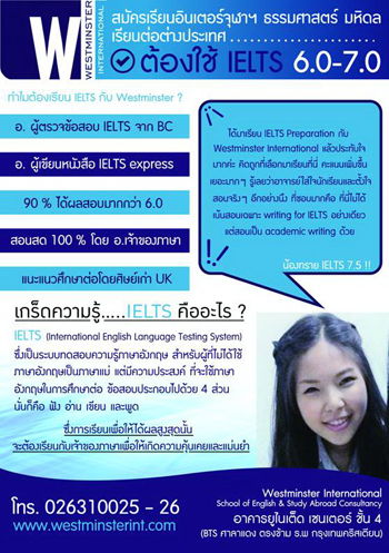 เรียน IELTS เรียนภาษาอังกฤษ เรียนต่ออังกฤษ 1 ปี พร้อมวีซ่า Tire 4 Student สอนโดยอาจารย์เจ้าของภาษาและ Examiner ฟัง พูด อ่าน เขียน ได้อย่างถูกต้อง มั่นใจ กับครูจากอังกฤษ พร้อมโปรโมชั่นพิเศษ เรียนภาษาอังกฤษ แบบอังกฤษ กับครูอังกฤษ ที่ Westminster International www.westminster.co.th โทร. 026310025-26