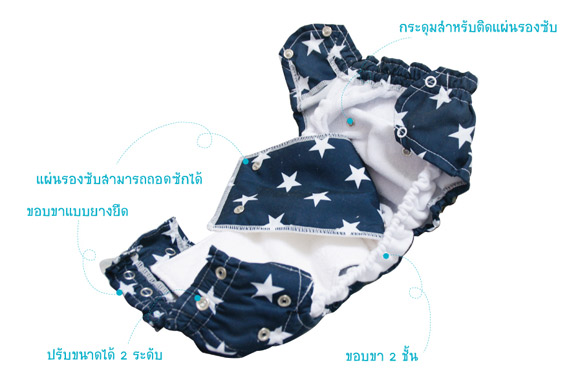• บริเวณเป้ามีกระดุม 6 เม็ดไว้ติดกับแผ่นรองซับ เพื่อกันไม่ให้