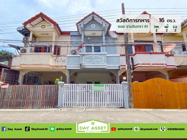 ขายทาวน์โฮม 2 ชั้น หมู่บ้าน สวัสดิการนายทหาร : Military Welfare Village Ramintra 61 แถม แอร์/ผ้าม่าน/แทงค์น้ำ/ปั๊มน้ำ ของอื่นๆพร้อมเฟอร์นิเจอร์บิ้วอินทั้งหลัง ใกล้สถานีรถไฟฟ้าสายสีชมพู สถานี วัชรพล เนื้อที่ 16 ตร.ว. ขายเพียง 2,390,000 ล้านบาท