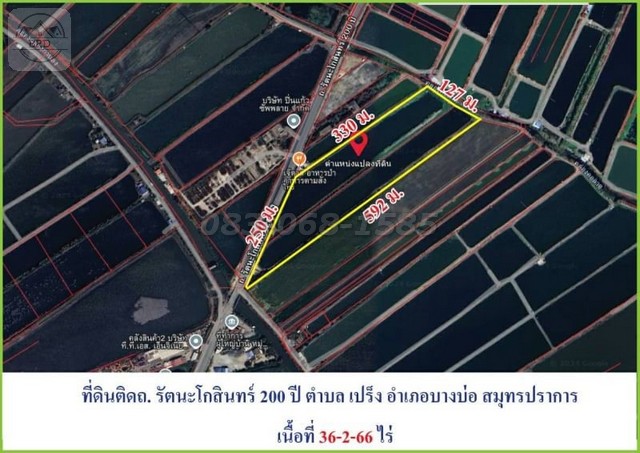ขายถูกที่ดินติดถนนรัตนโกสินทร์ 200ปี (เนื้อที่ 36-2-66 ไร่ ขายไร่ละ 6 ล้าน) ต.เปร็ง อ.บางพลี สมุทรปราการ
