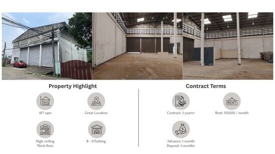 ให้เช่าโกดัง437ตร.ม.เหมาะสำหรับยิมฟิตเนสโชว์รูมสินค้าร้านอาหารขนาดใหญ่ย่านแจ้งวัฒนะหลักสี่